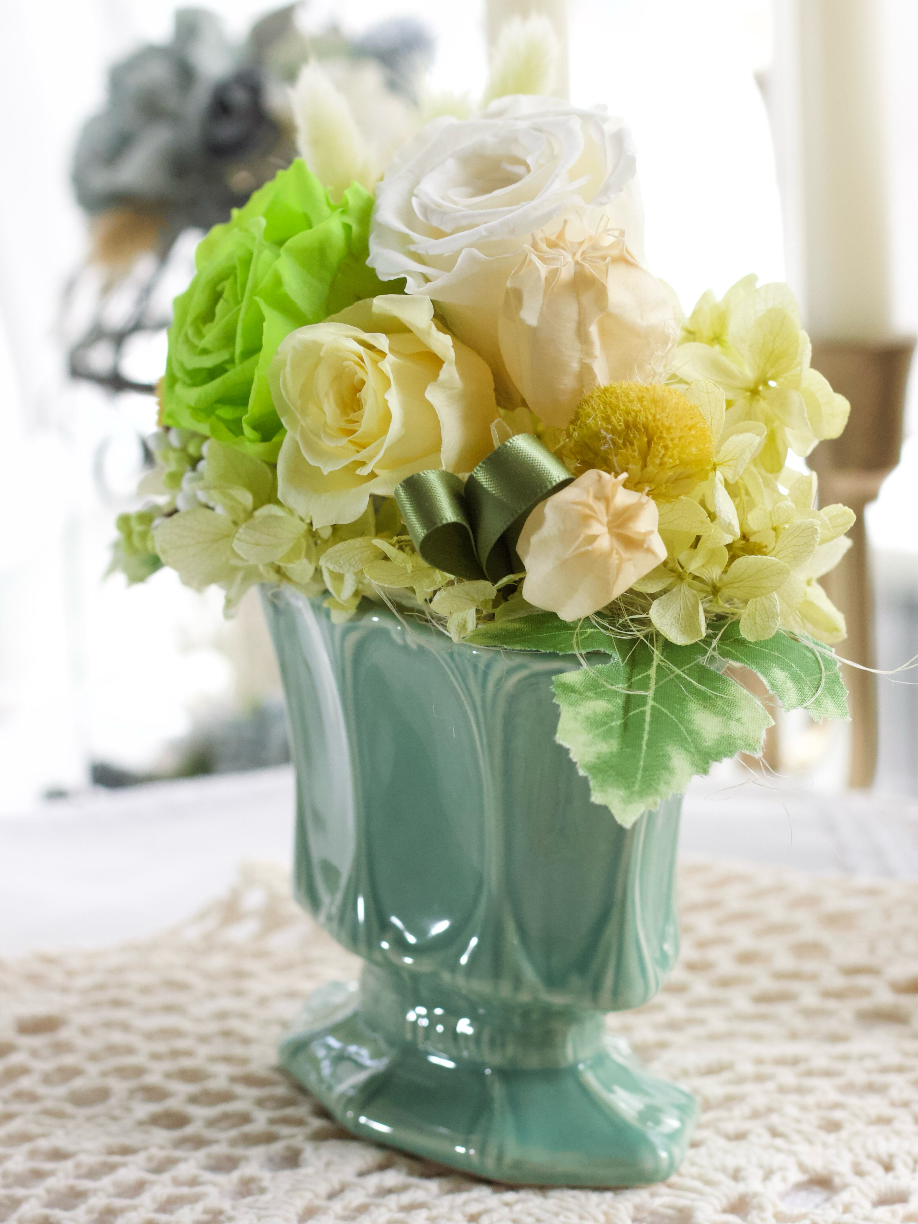 フレッシュなグリーンカラーの小ぶりなベースにホワイトグリーン系のプリザーブドローズを合わせた、